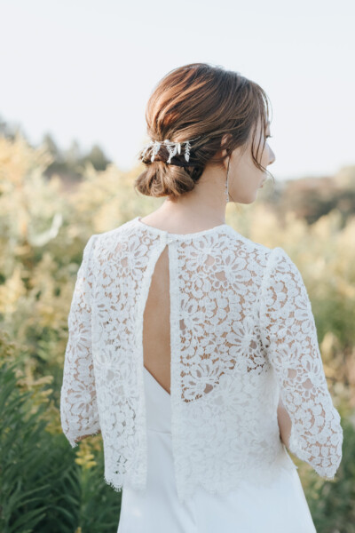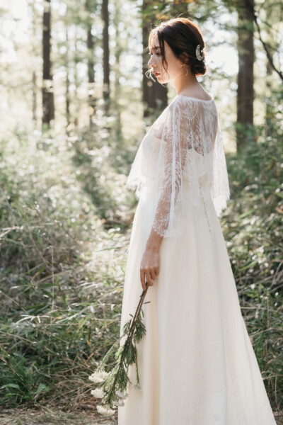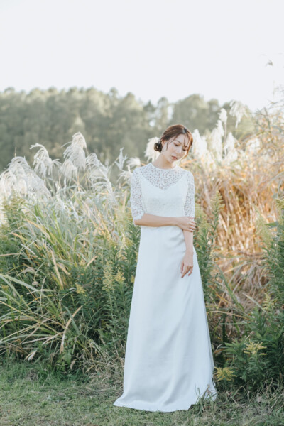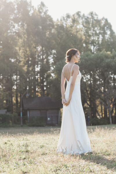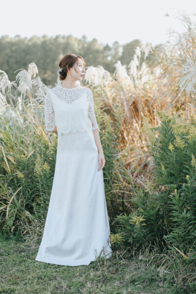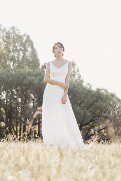 全体的にビンテージ感のあるスッキリとしたおしゃれなデザインになっており、都市部でも自然の中でも、どこでも似合うドレスです。